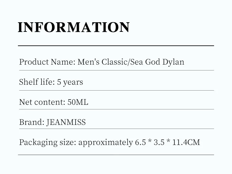 SPECIFICATIONS Alcohol Concentration: 76 Alcohol Content: Alcoholic Brand Name: JEAN MISS Flavor Concentration: Flavor Concentration 3~5% Fragrance Note: Woody Gender: Male Hign-concerned Chemical: None NET WT: 50ml Origin: Mainland China
